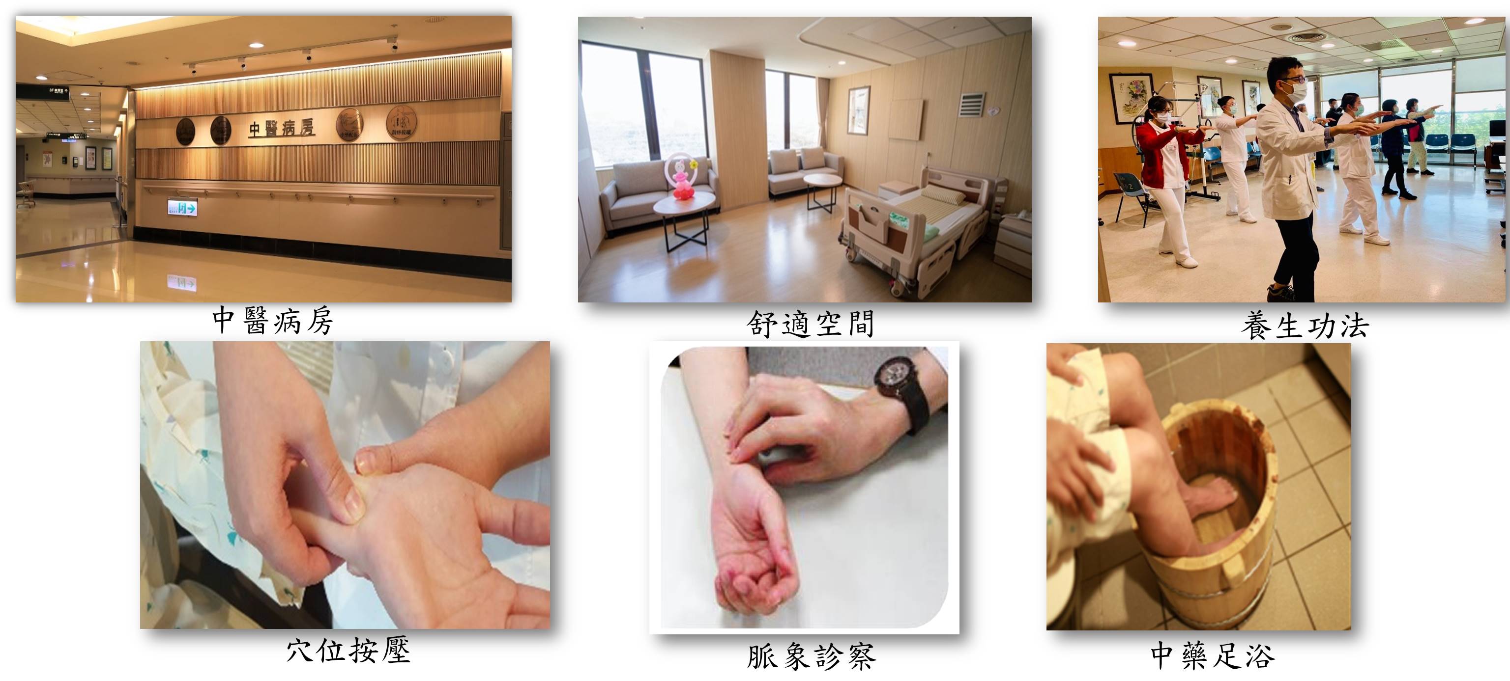 由中醫部擁有中西醫執照之醫師群、受過中醫護理訓練之護理師、受過中醫藥訓練之藥師共同組成專業照護團隊。經由醫師評估後提供中藥、針灸、推拿、藥浴調理全身經絡氣血,促進病友與家屬身體健康。