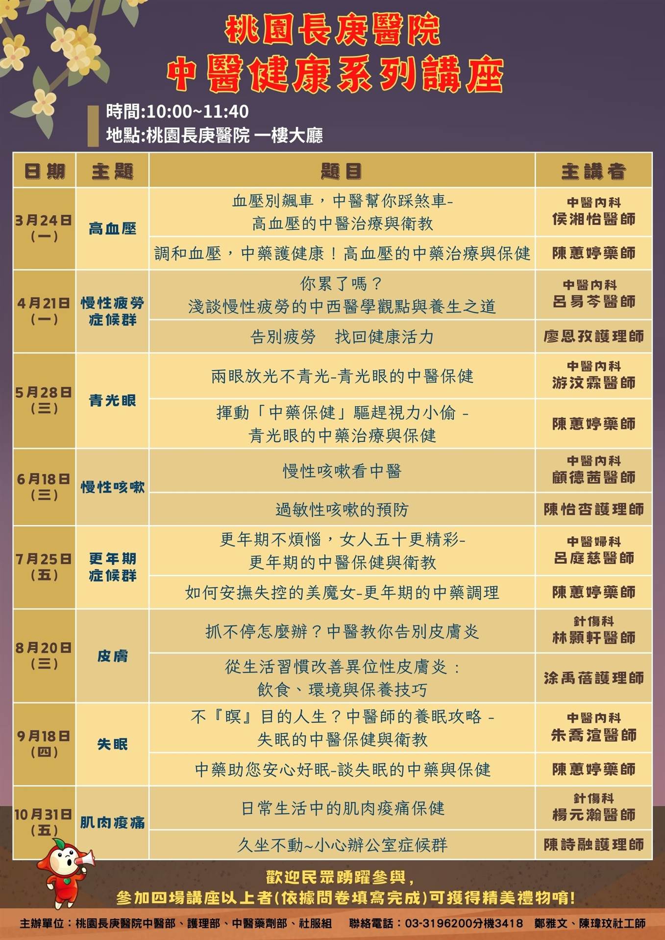 為此,桃園長庚醫院特別規劃「中醫健康系列講座」,於10月邀請專業醫師為民眾解析常見的肌肉痠痛問題,並分享中醫的保健妙方,幫助大家舒緩痠痛、恢復活力。