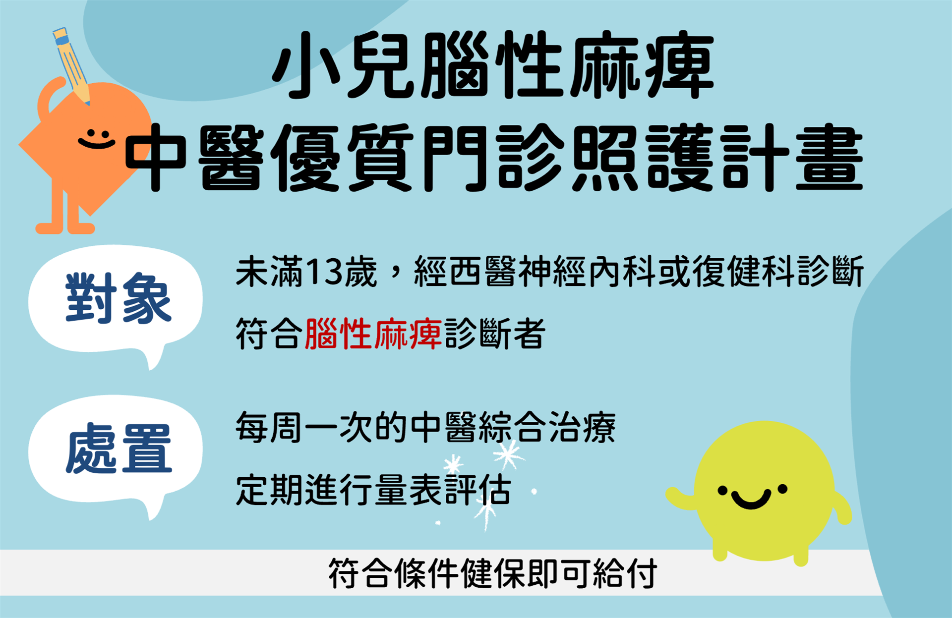 小兒腦性麻痺中醫優質照護門診強調以病人為中心之綜合評估及處置,依孩子的體質、症狀表現、功能狀況與照護需求,規劃合適的中醫介入方式。